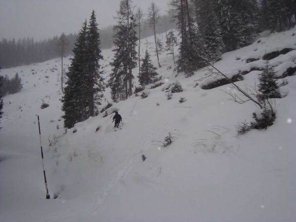 Neuschneeabfahrt über Waldschläge