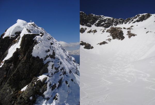 Kletterstelle am Gipfelgrat (li, ), Abfahrt Moarkar (re.)