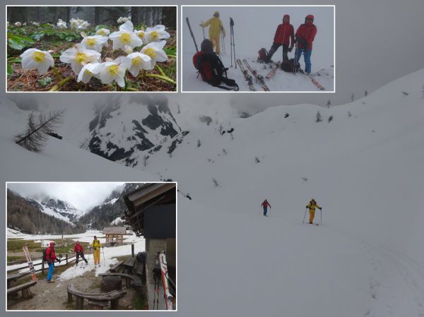 Aufstieg im Kar, Schneerosenteppich, Alm &nebeliger Gipfel